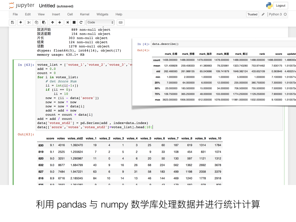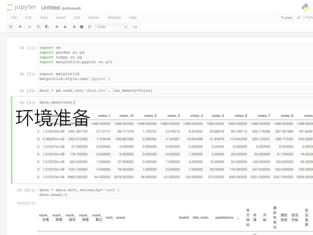 导出了 CSV 之后,就可以清理数据并进行初步观察了。同样,使用 Excel 打开 CSV 文件可能会遇到编码问题,意外的是 Numbers 并不会。在 Numbers 里你可以肉眼直接观察明显有误的数据、数据量极少即大部分条目没有的数据项,并做简单的处理和增删操作。而在 Anaconda 中启动 jupyter notebook 并调用 pandas 和 numpy ,可以进行数据透视和一系列更强大的统计计算,例如计算每一个属性在条目中的有效内容覆盖率,计算数值数据的均值、方差、中位数、极差等数学统计信息。配合 matplotlib 绘图库,你甚至马上可以画出简单的统计图表。