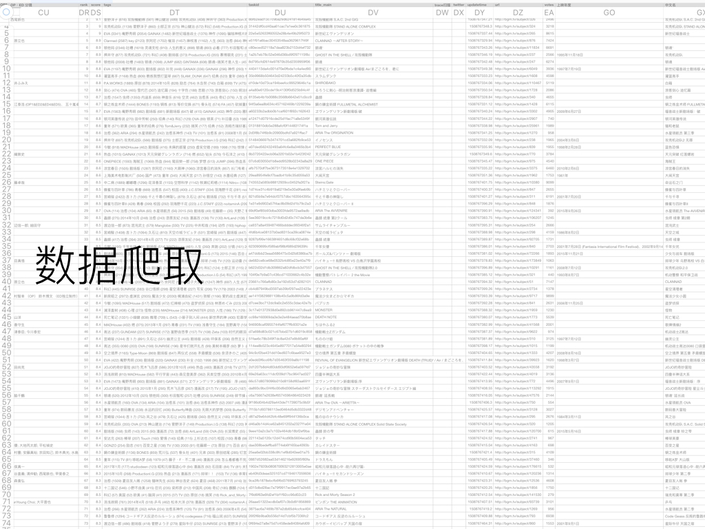 根据 Bangumi 番组计划的动画条目特征,最后决定将动画原文标题和译名、左侧的制作信息和 STAFF 表、用户为动画打的标签和标记人数、观看进度想看看过等标记人数、打分 Score 排名 Rank 和 1 ~ 10 每个分数段的打分人数都抓取下来。