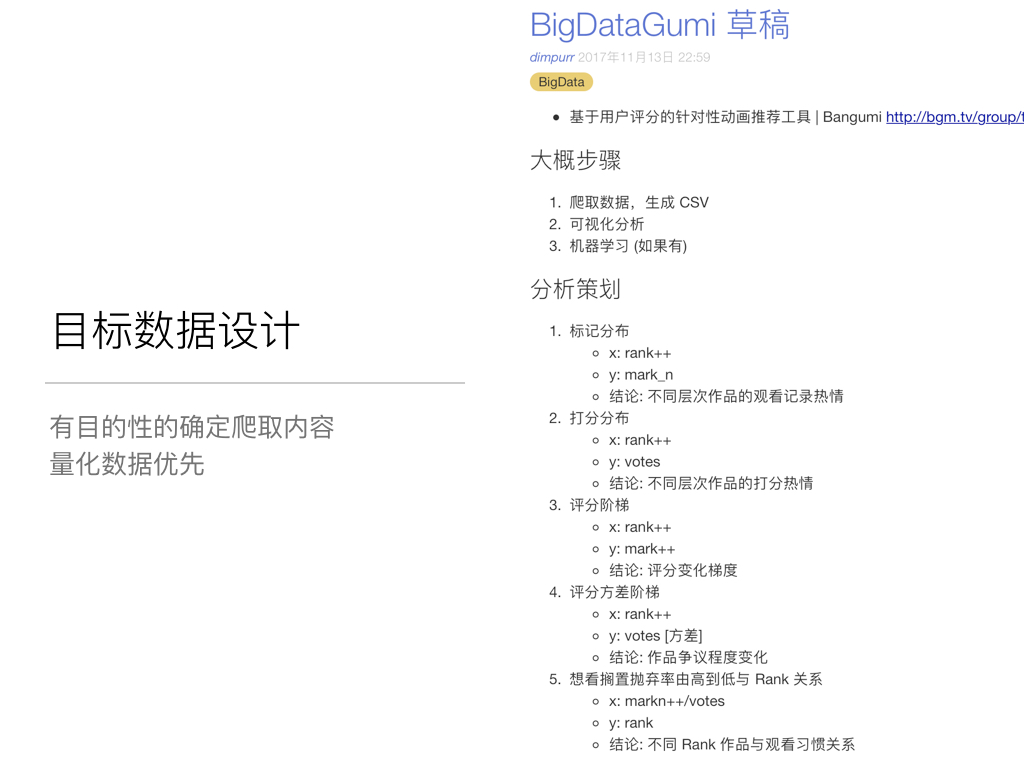 这篇文章记录了利用 Bangumi 番组计划 (bgm.tv) 网站的动画条目和评分数据,进行数据统计分析的项目「BigDataGumi」的初步进展,包括设计网页爬虫抓取数据、利用可视化分析工具尝试获取有价值信息的实际操作部分。一些没有实现的想法和没有呈现在结果中的可能的学习方向,也会作为学习经历的一部分记录。项目的下一步想法是训练一个 tag-orinted 的机器学习模型,能够计算动画的 STAFF 构成和 TAG 标签属性对评分影响的权重,并根据 STAFF 和 TAG 数据预测新番的最终稳定评分,在撰写本文时仍在进行中。