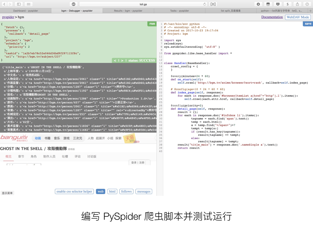 PySpider 的可视化 IDE 设计非常易用,在右边编写 Python 脚本时,你可以在左边实时浏览目标页面,并且查看抓取到的地址列表或者 JSON 数据(或者说是 Python 对象),并且手动操作单步抓取。