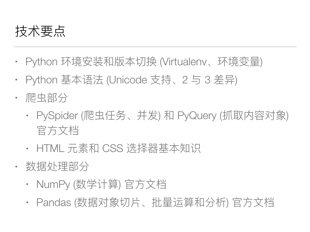要注意的一个坑是,截止撰文时 PySpider 仍未完成 Python 3 的支持,需要 Python 2 环境运行。因此如果需要管理多个 Python 版本,可以考虑使用 pyenv 或者 virtualenv ,个人经验后者似乎更方便。