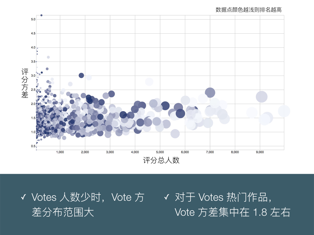 无论作品 Rank 多少,是神作还是渣作,方差的分布模式都差不多。并不存在神作或者渣作哪一方往往争议更大的情况。