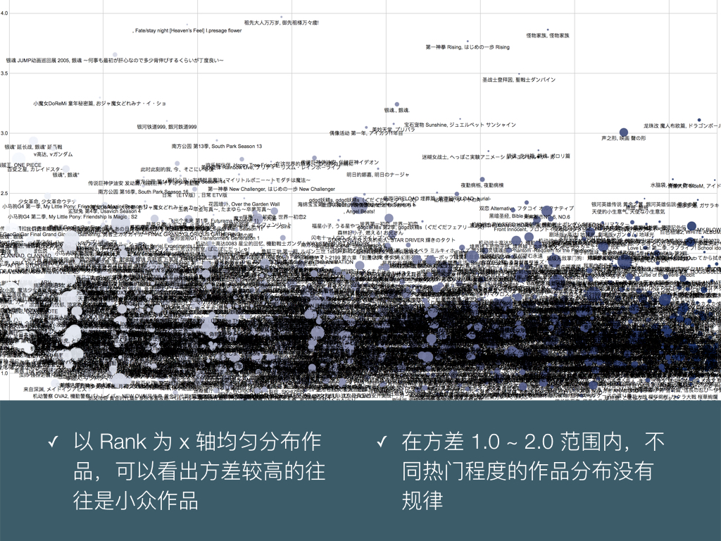 把作品按 Rank 由高到低从左向右排列,纵轴是方差,可以更清楚的观察到方差拔群的作品:不过大多是评分人数少的小众作品。圆点的大小代表投票人数,其实在这张图我们可以更加感受到:在热门作品中只有声之形、Angel Beats、海贼王、银魂这四部的方差高的不可思议。