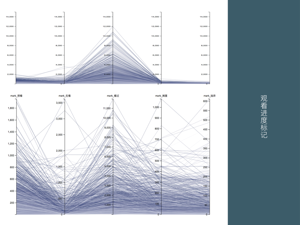 这里是对 Bangumi 用户标记观看进度的行为分析,第一张图是统一尺寸的坐标轴,显然用户最喜欢标记的是看过,之后是想看和在看,搁置和抛弃的标记相对较少。在看数较多的几个数据,明显是当前正在上映的新番。