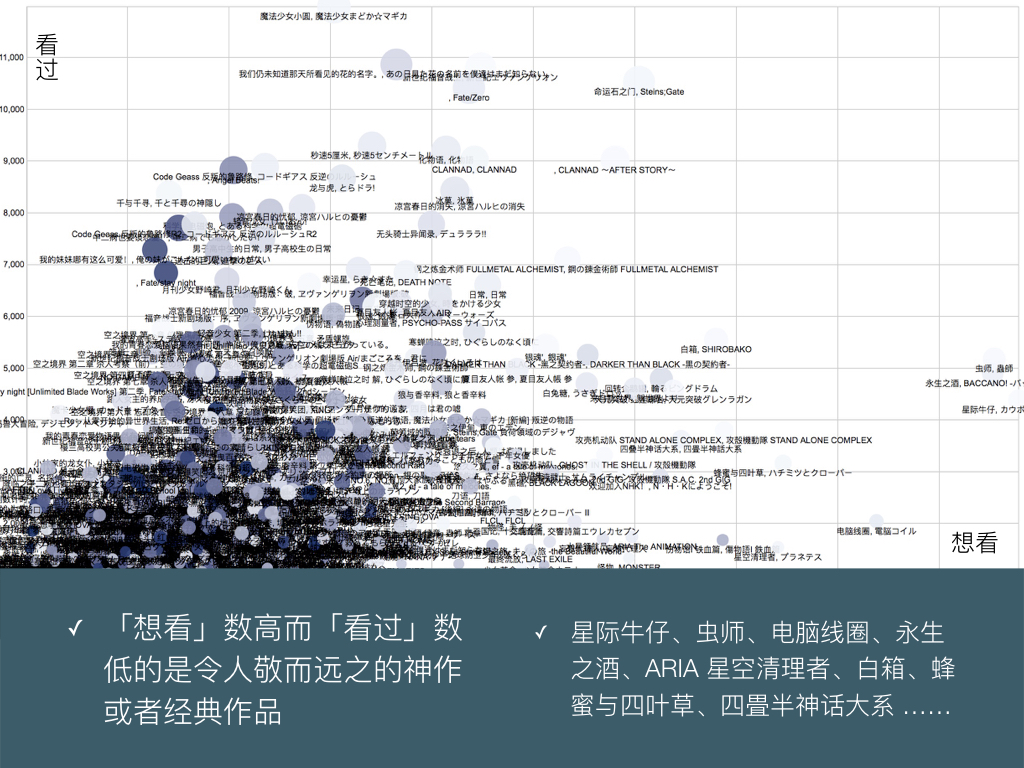 筛出图表右侧这些想看数独树一帜,但是其实大部分人最后都没看的作品,就可谓是个简单易懂的补番装逼目录了。