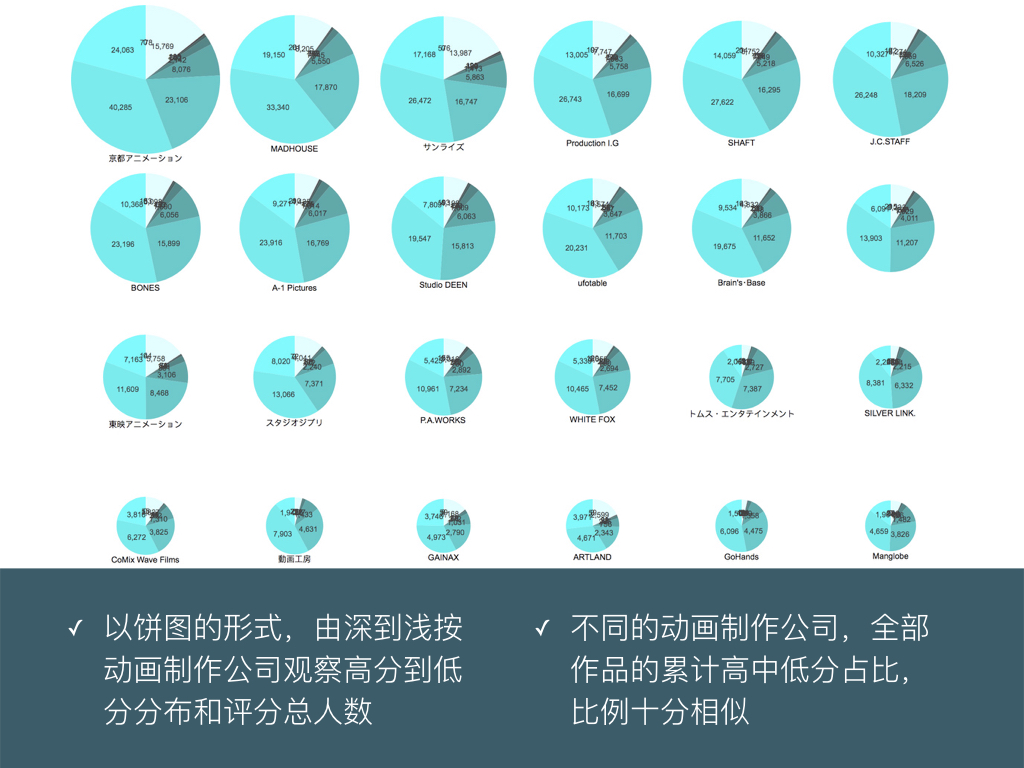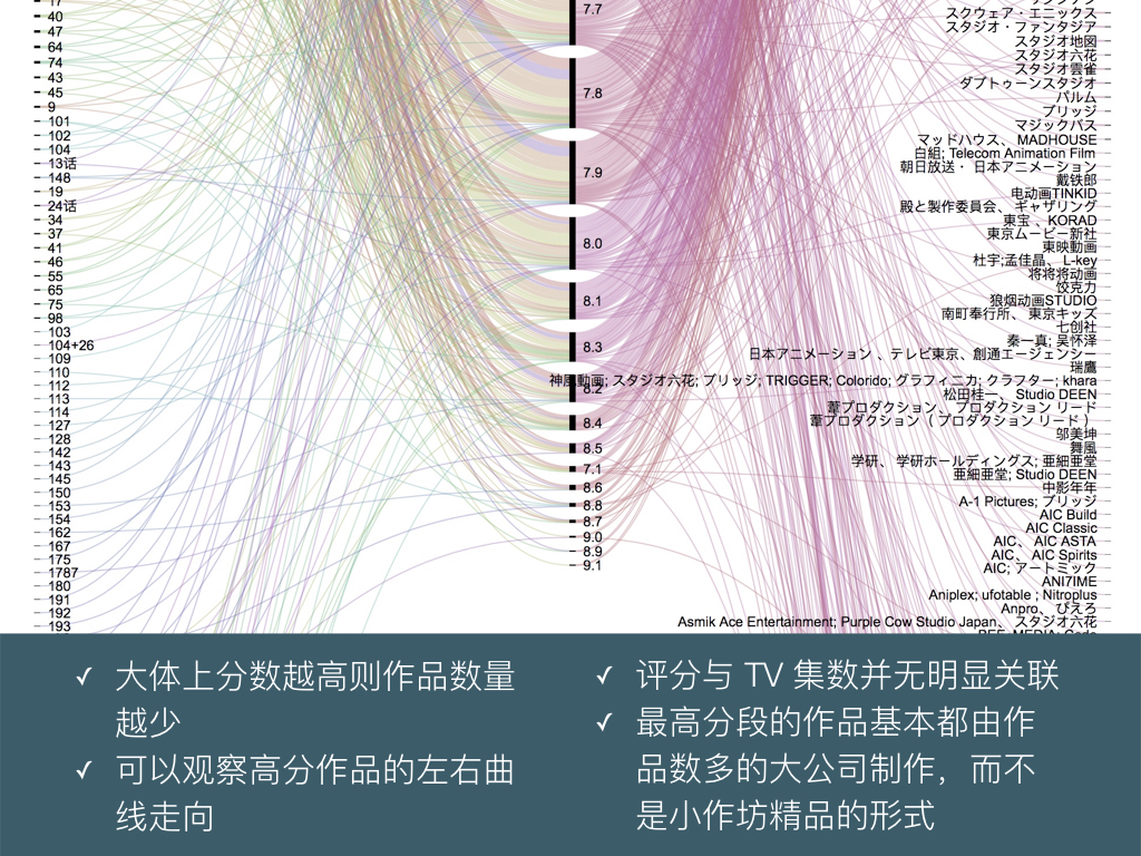 左侧的动画集数、右侧的动画制作公司都按照作品数目由多到少排列。分数段越高,所含的作品就越少。