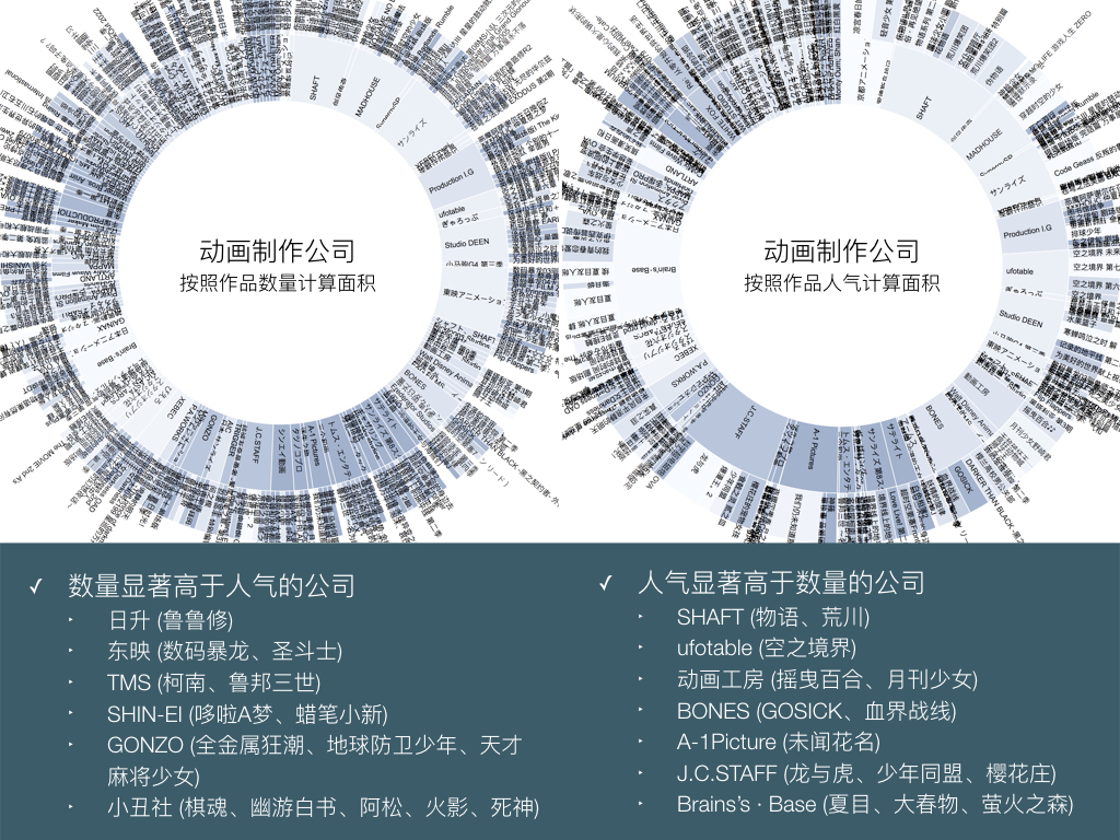 一部分的动画制作公司数量显著高于人气,另一部分则是人气显著高于数量。其中的作品类型也泾渭分明。