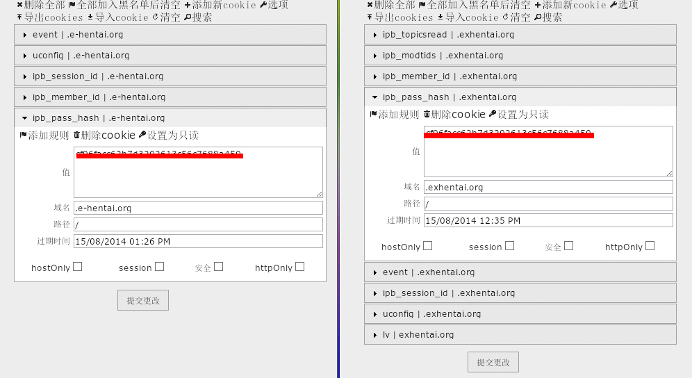 但是呢,明明 EHentai 在 Cookie管理器 里呆的好好的,为什么还是打不开呢?这时机智的撸主灵机一动,给 Chrome 下载了一个 Cookie 编辑器,把 EHentai 下的 Cookie 全部原样拷到 ExHentai 下,然后域改为 exhentai.org 。还有 forum.e-hentai.org 的 Cookie 也死马当活马医改成了 exhentai.org ……再次打开 ExHentai ,目标达成!