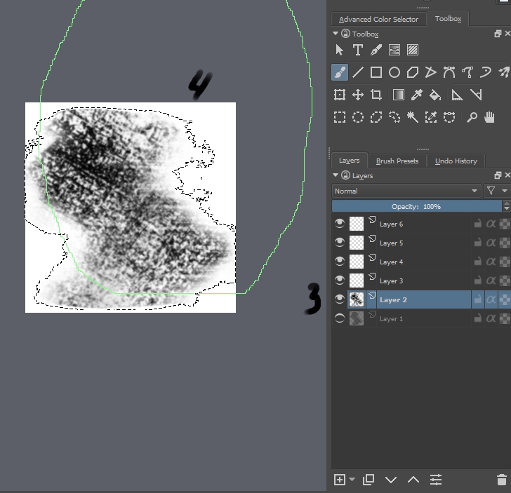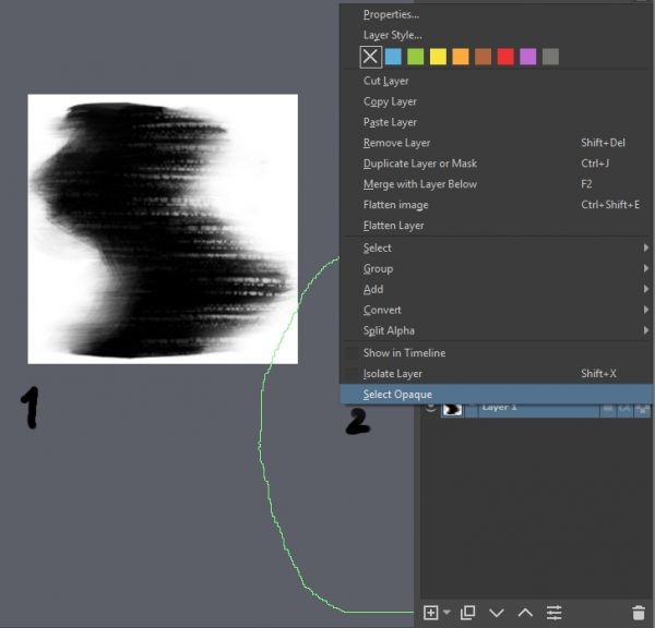 插入(或者手动绘制)「基础」贴图。这个贴图会决定笔刷贴图的形式、尺寸、比例并仅用于创建选区。随后右键点击该图层,在菜单中选择「选择不透明度 (Select Opaque)」。