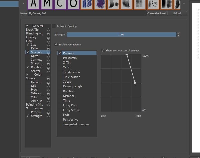 于是我们有了一个还未经设置的笔刷贴图,接下来进行一系列配置吧。对于方形笔刷贴图,我建议你使用镜像(Mirror)以增加多样性。对圆形笔刷贴图你也可以使用旋转(Rotation)。你也可以调节空隙曲线增加某种动态笔压,我以这种方式让高压力时能画出厚重的线条。