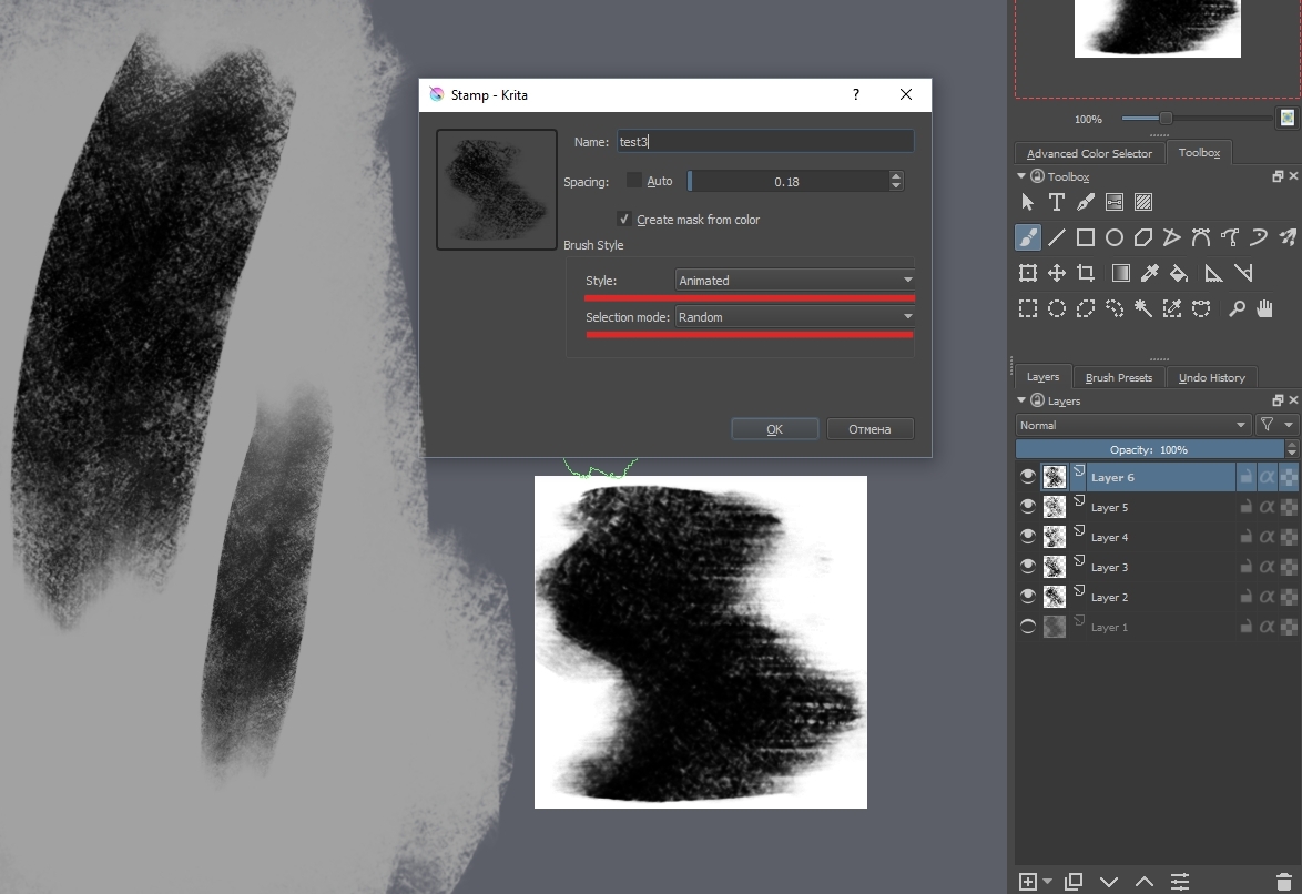 现在让我们创建新的动画笔刷材质。点击 +印戳 (+Stamp) 按钮并选择 风格:动态 ,模式 :随机 (当然你也可以是用别的)。