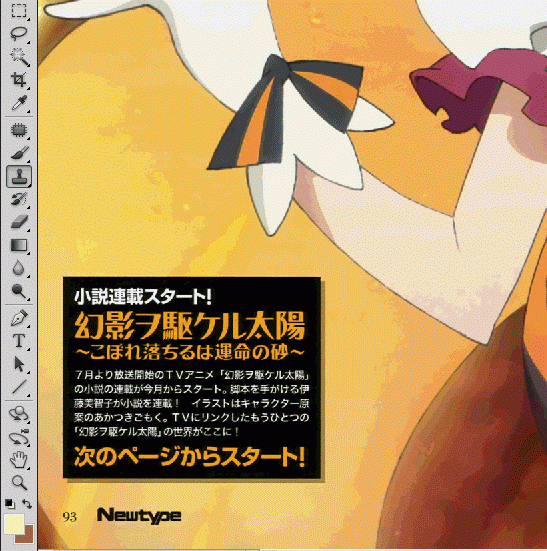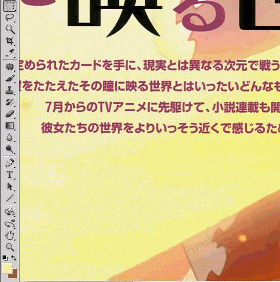 本PO讲的是修补工具。修补工具的原理和仿制图章差不多,也是从别的区域选择图案填充到指定的地方。跟仿制图章不同的是修补工具有一个特性,就是在复制图案到目的地之后修补工具会 自动适应 周围的颜色,就像自带光学迷彩一样。如果复制的源图案不明显,周围的色彩又比较鲜明,有可能复制的图案会被后续的适应颜色覆盖而看不出来。修补工具在附近颜色差不多而且附近又有类似形状供抓取的地方使用效果比较好,像引索PO原图右上方黄色天空下的一大片字、“瞳に映る世界”下面的几行小字就很适合用修补工具。