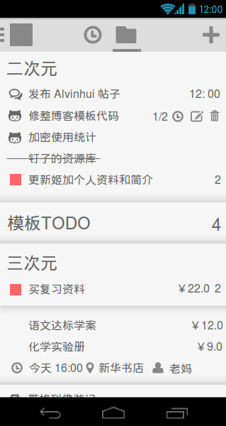 从整个产品的维度来考虑,「任务」应该是沟通三个组件的概念,最后选用了类似 Any.Do 的任务列表作为设计出发点。画线稿的过程中自然而然的发现原生 Holo 风格非常适合这类结构清晰的应用于是就上手了,最后的成品是一个以侧边栏(现在看来应该改用原生 Drawer )区分 Todo 、记录和日历,以 Tab 切换视图的 Holo 风格界面。