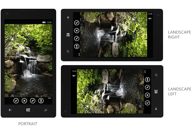 WP提供三种屏幕方向,分别是纵向、横向靠左和横向靠右。在横屏时,状态栏从默认的 32px 扩展到 72px。可以为应用定义全屏视图,并选择是否在全屏下显示状态栏和应用栏。