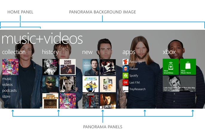 Pivot 控件往往作为 Panorama 控件的二级界面使用,同时不推荐从一个 Panorama 控件跳至 另一个 Panorama 控件,容易使得用户忘记自己身处的位置。可以增加一个 “主页” 页面,显示所有其余标签的列表,用户就不必依次滑动导航至目标标签。同理,也不必让用户在 主页 开始,而可以在进入时先转到更有趣的主题。